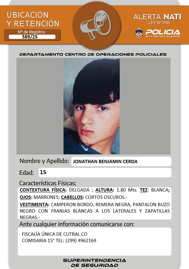 Ante cualquier información, las personas pueden aportar datos en la Fiscalía Única de Cutral Co o por la comisaría 15° del barrio Pampa, al teléfono fijo 496 2169.