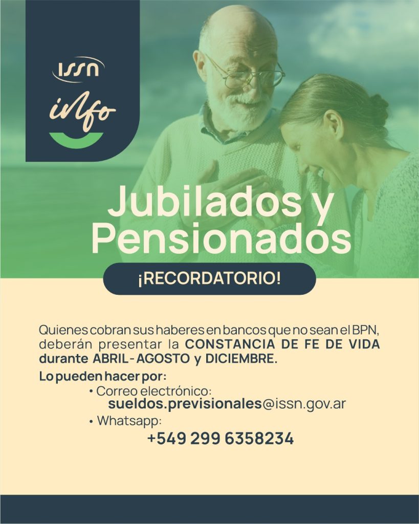 El Instituto de Seguridad Social del Neuquén (ISSN) informó que los jubilados y pensionados que cobran sus haberes a través de entidades bancarias que no sean el Banco Provincia del Neuquén (BPN) deben presentar la Constancia de Fe de Vida en los períodos establecidos por el organismo.