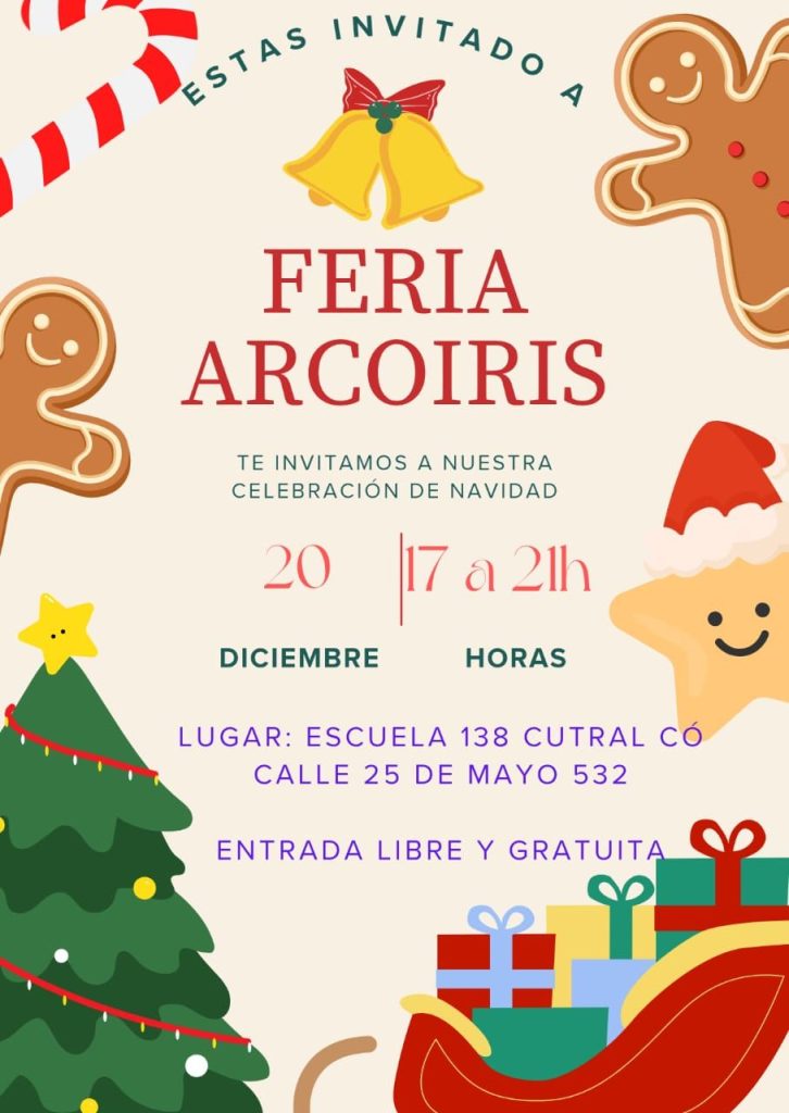 La comunidad de Cutral Co está invitada a participar de la Feria Arcoíris, que se realizará el sábado 20 de diciembre, de 17 a 21 horas, en las instalaciones de la escuela N.º 138, ubicada en calle 25 de Mayo 532.
