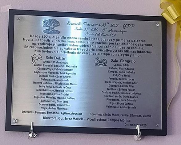 “Desde el Equipo de Gobierno de la Escuela Primaria N° 102, estamos felices de haber inaugurado un espacio muy especial, el descubrimiento de una placa recordatoria, ya que, el Jardín Anexo que funcionaba en la institución desde 1.971, hoy deja de ser parte de esta escuela”, expresaron desde el establecimiento.