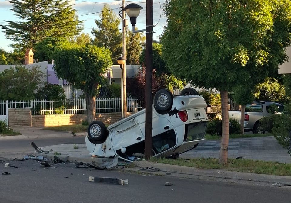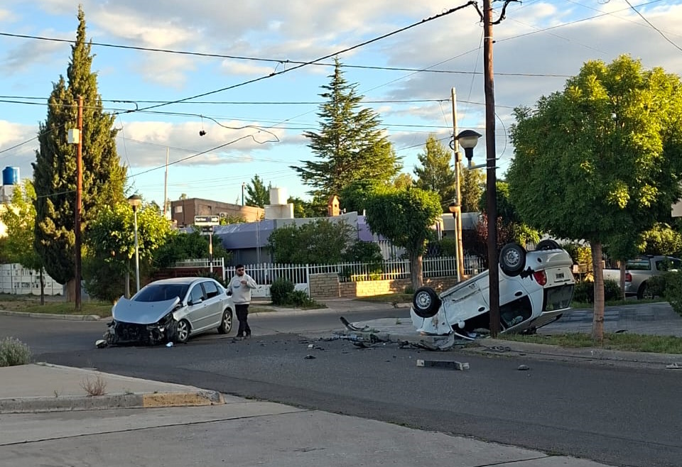 Esta mañana dos vehículos chocaron en la esquina de Principal Saez y San Juan. Uno de ellos quedó volcado sobre la vereda sureste.