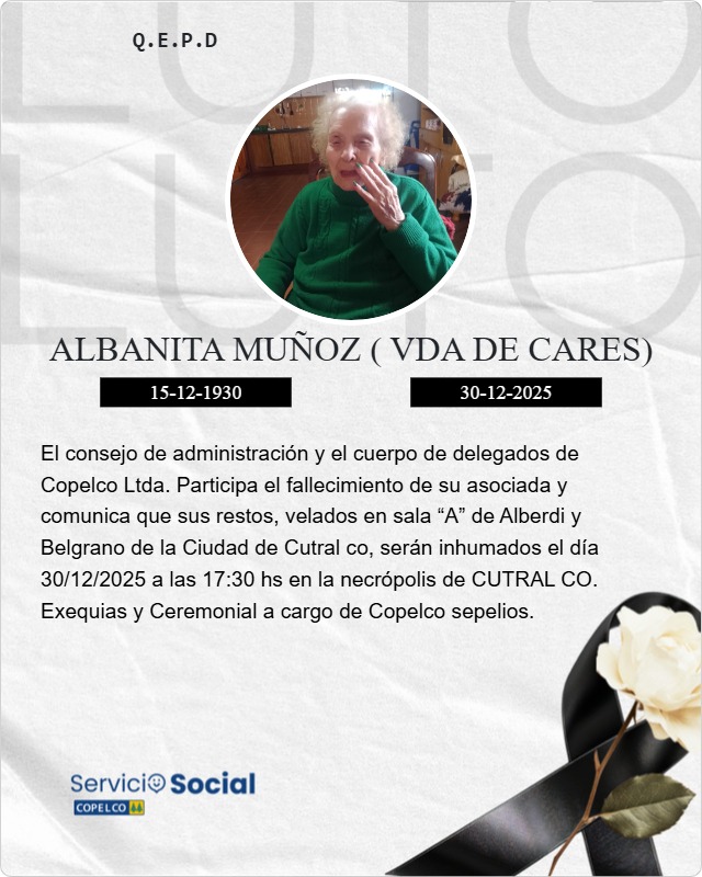 El Consejo de Administración y el Cuerpo de Delegados de Copelco Limitada participan el fallecimiento de su asociada y comunica que sus restos velados en sala “A” de Alberdi y Belgrano de Cutral Co serán inhumados el día 30/12/2025 a las 17.30 horas en la necrópolis de Cutral Co. Exequias y Ceremonial a cargo de Copelco Sepelios.