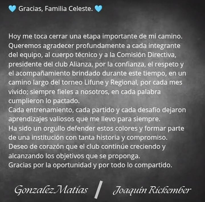 El mediocampista Rikemberg y el delantero Gonzalez se despidieron del pueblo celeste con un comunicado que expresaba su agradecimiento y 299 Deportes pudo saber que su destino estaba en el Santo para lo que queda de Torneo Regional y seguramente la Copa Provincial de febrero.
