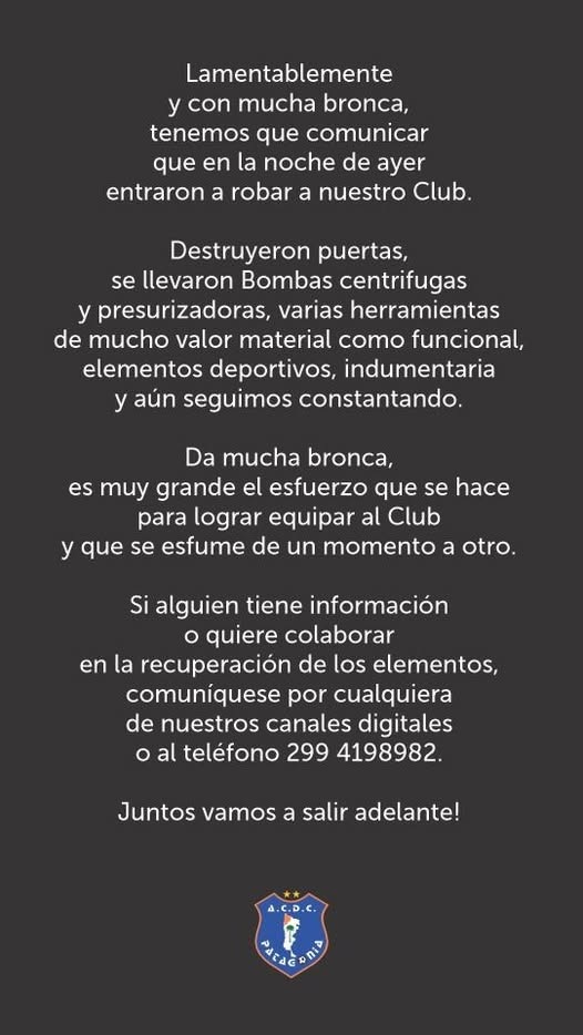 El Club Patagonia de Neuquén comunicó que fue víctima de un robo en sus instalaciones durante la noche de ayer. Los autores del hecho ingresaron al predio tras destruir las puertas de la institución.
