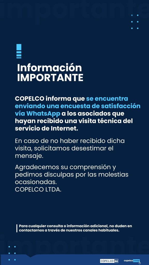 Se indicó que efectivamente la cooperativa envía a través de la red social WhatsApp una encuesta, pero está dirigida exclusivamente a aquellas personas que pidieron el servicio técnico para internet.