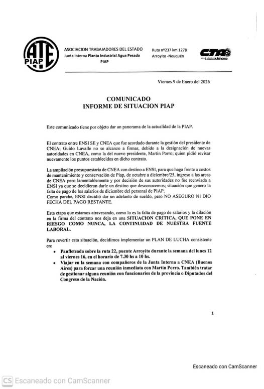 Desde ayer, lunes 12 y hasta el viernes 16 de enero, trabajadores de la Planta Industrial de Agua Pesada (PIAP), nucleados en ATE Seccional Senillosa, Arroyito y El Chocón, llevarán adelante medidas de acción directa sobre la Ruta Nacional N°22, a la altura del puente Arroyito, en el horario de 7:30 a 10 horas.