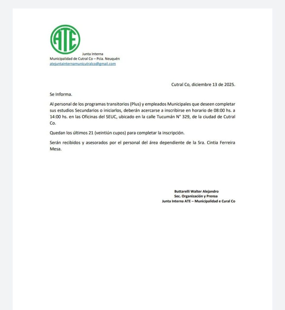 La junta interna de ATE de la municipalidad de Cutral Co informó que quedan lugares disponibles para quienes deseen finalizar o comenzar sus estudios secundarios.
