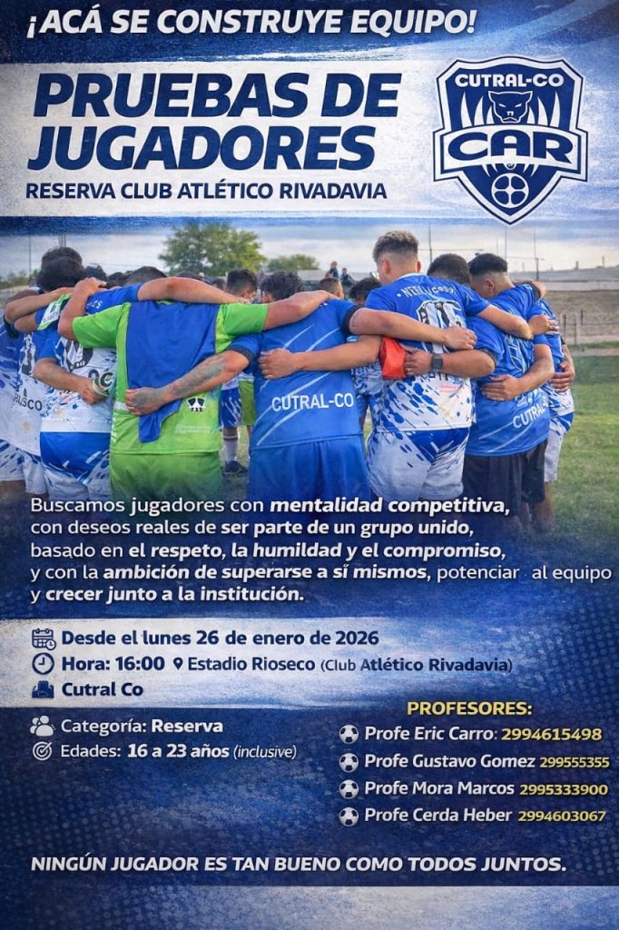 Las evaluaciones comenzarán el próximo lunes 26 de enero de 2026. La cita es a las 16:00 horas en el Estadio Rioseco, sede del club en la localidad de Cutral Co.