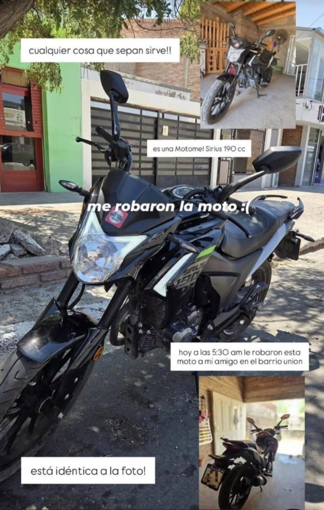 Se trata de una Motomel Sirius 190 cc, propiedad de un vecino de la ciudad. Tras el robo, familiares y amigos iniciaron una cadena de difusión para intentar recuperar el rodado.
