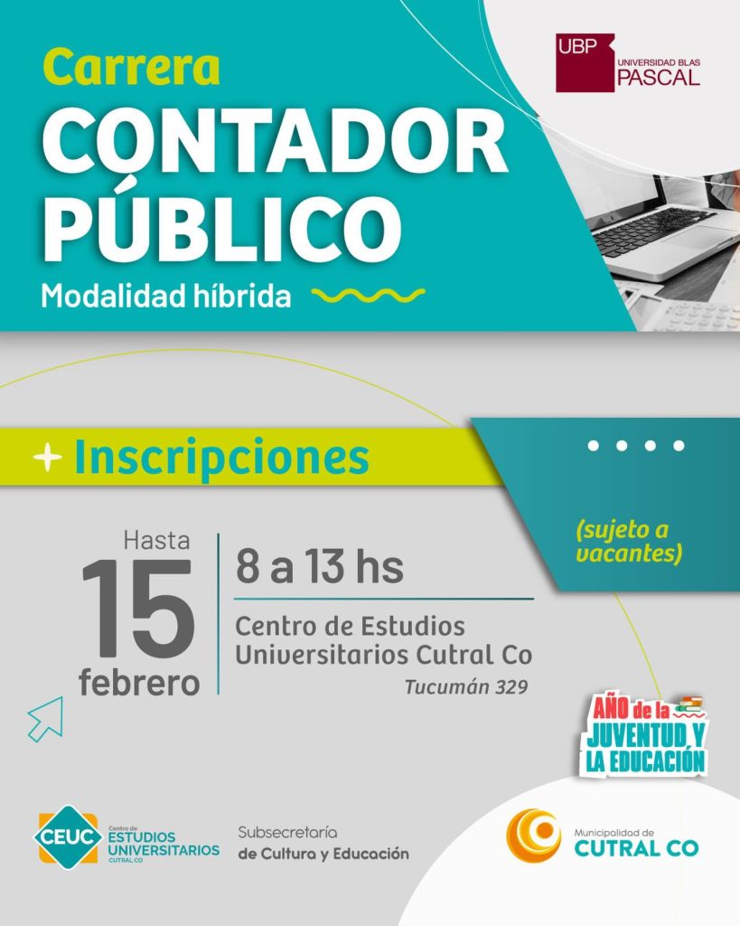 Cutral Co amplía su oferta académica universitaria con la apertura de nuevas vacantes para la carrera de Contador Público, una propuesta formativa que se dicta en conjunto con la Universidad Blas Pascal y que permite a los vecinos y vecinas estudiar una carrera de grado sin salir de la ciudad.