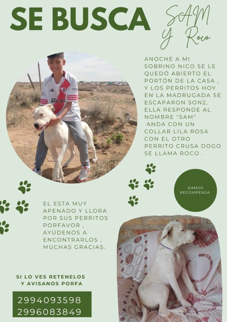 Se trata de Sam, una hembra que responde a ese nombre y lleva un collar lila/rosa, y Roco, un macho cruza Dogo.