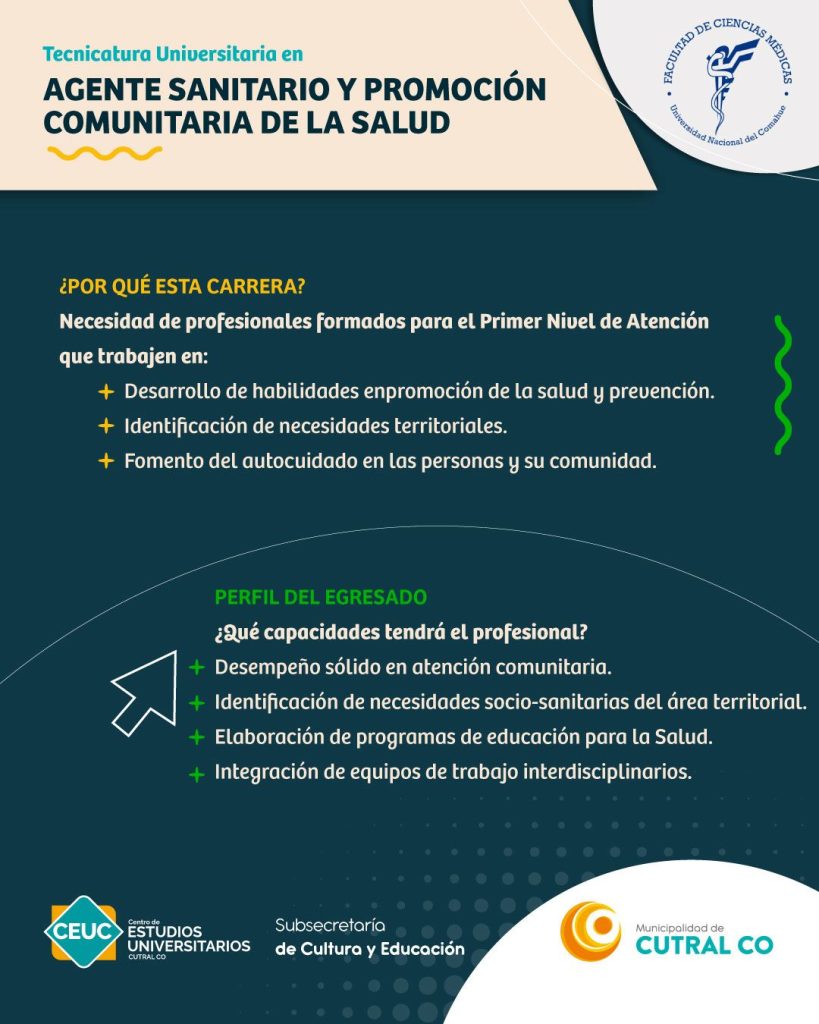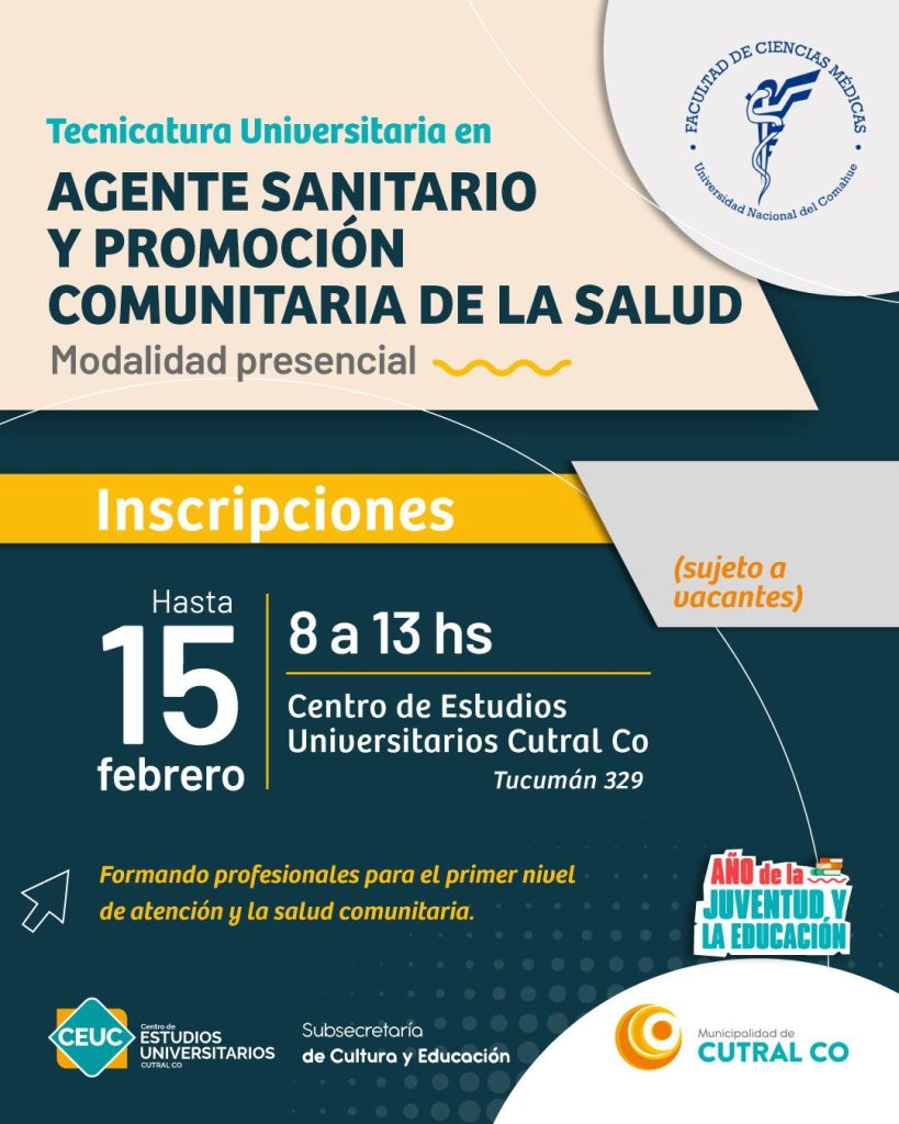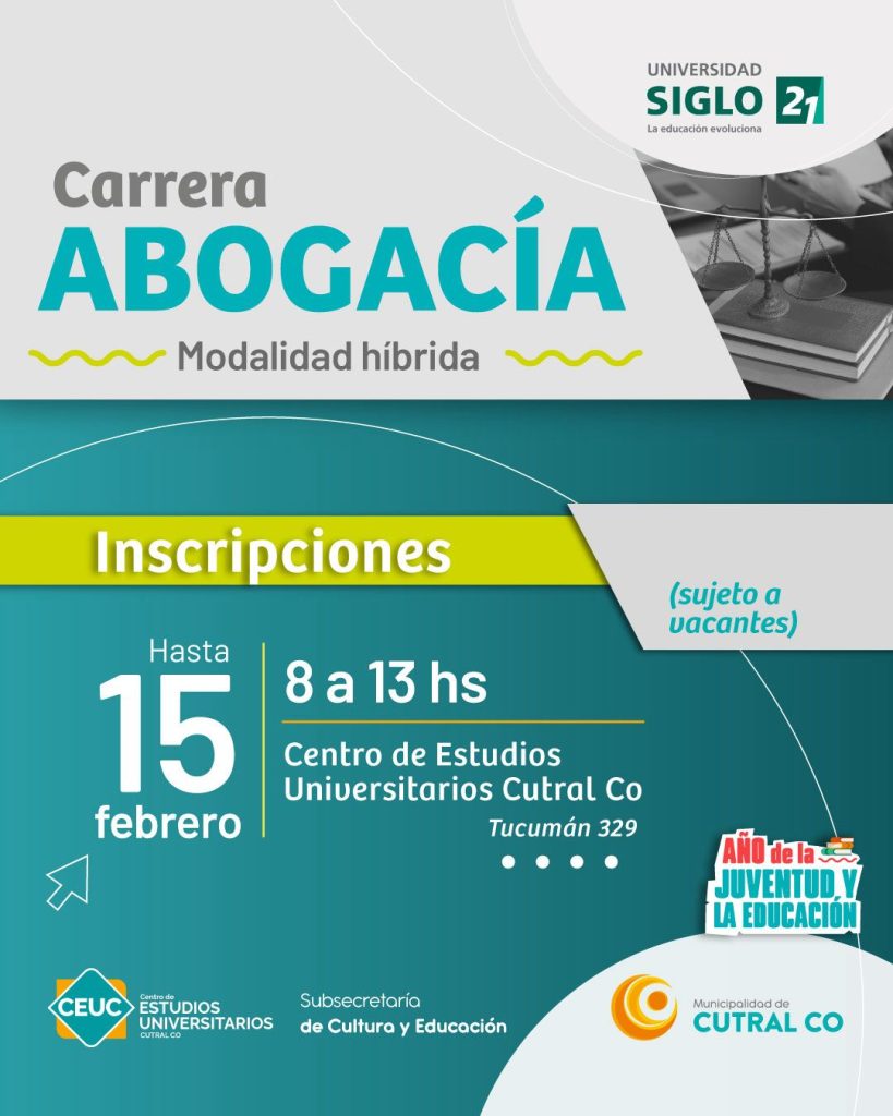 Para abogacía -que sserá bajo la modalidad híbrida- y para la tecnicatura en agente sanitario, se pueden hacer las consultas e inscripciones de manera presencial en Tucumán 329, donde funciona el Centro de Estudios Universitarios Cutral Co – CEUC-. El horario de atención establecido es de 8 a 13 horas.