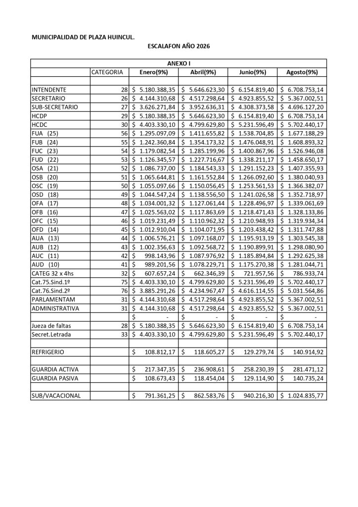 La Municipalidad de Plaza Huincul oficializó el Escalafón Salarial correspondiente al año 2026, que establece los haberes del personal municipal y de las autoridades, con actualizaciones escalonadas del 9% en los meses de enero, abril, junio y agosto.