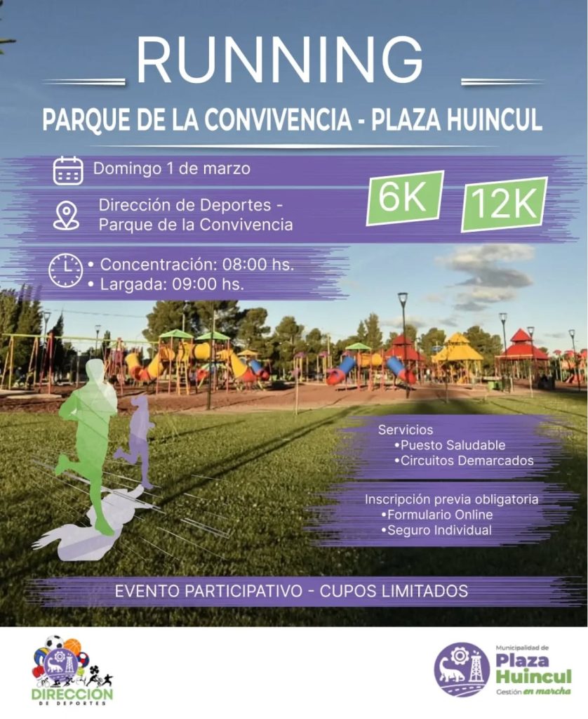 La Dirección de Deportes de la Municipalidad de Plaza Huincul convoca a la comunidad a participar en el evento Running Parque de la Convivencia, que se llevará a cabo el próximo domingo 1 de marzo de 2026.