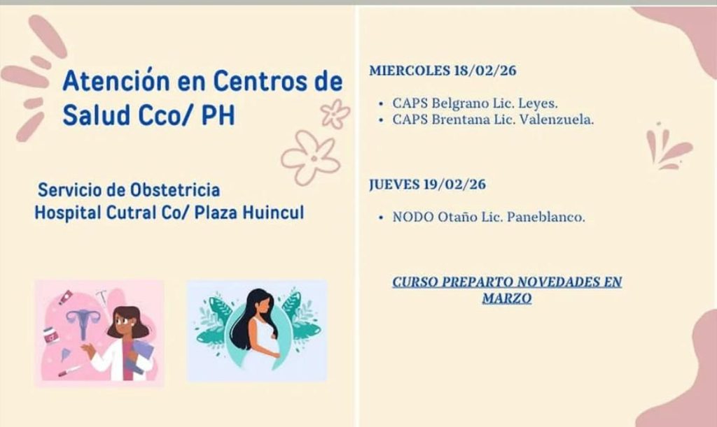 El Servicio de Obstetricia del hospital Cutral Co y Plaza Huincul informó el cronograma de atención en los Centros de Atención Primaria de la Salud (CAPS) de Cutral Co y Plaza Huincul. El miércoles 18 de febrero habrá atención en el CAPS Belgrano, a cargo de la licenciada Leyes, y en el CAPS Brentana, con la licenciada Valenzuela.