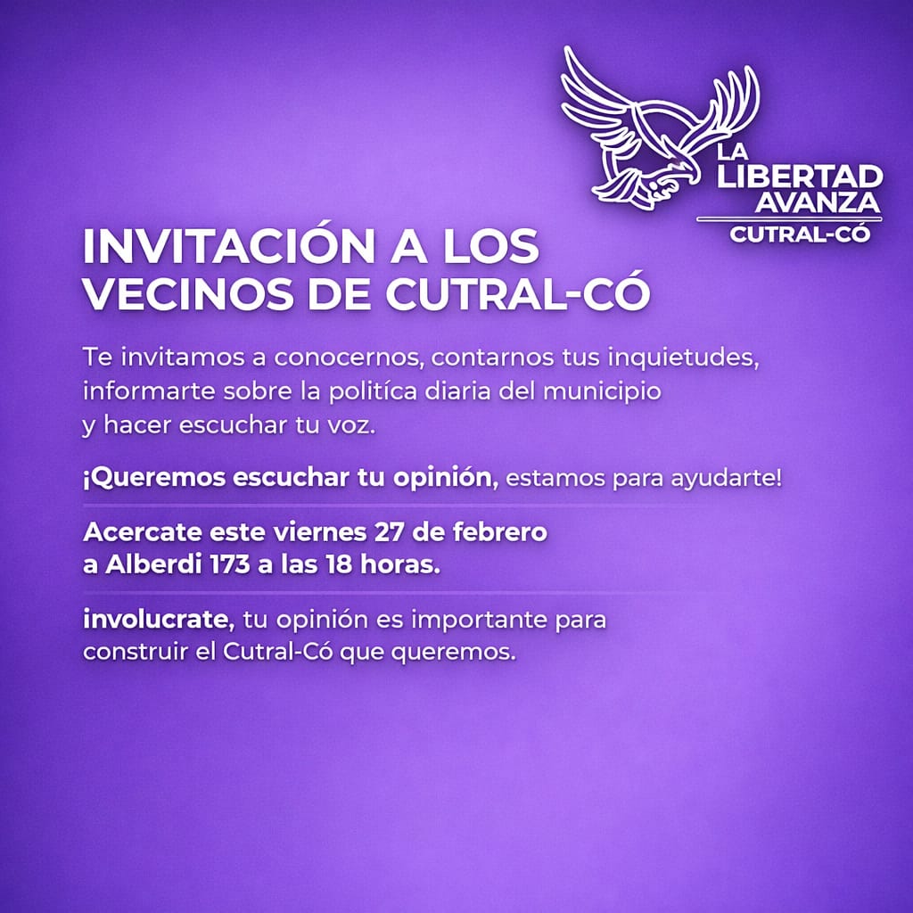 La reunión se hará el próximo viernes 27 de febrero, a partir de las 18, en la calle Alberdi N° 173 de Cutral Co. La idea es tener un espacio para compartir opiniones y el funcionamiento local de esta fuerza política.