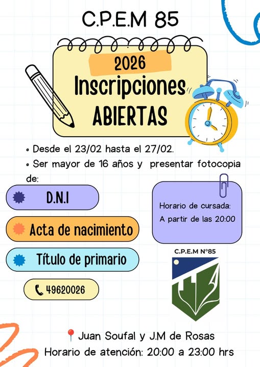 El CPEM N°85 informó que ya se encuentran abiertas las inscripciones para el ciclo lectivo 2026, destinadas a personas mayores de 16 años que deseen iniciar o retomar sus estudios de nivel medio.