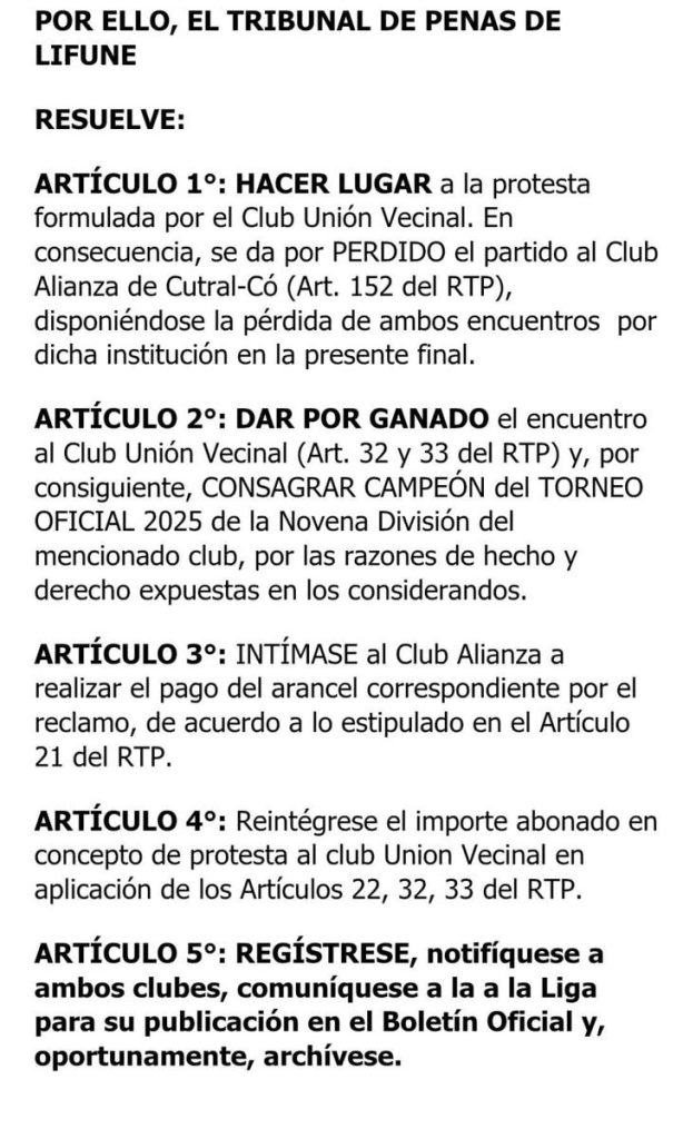 El tribunal decidió dar por válido el reclamo a Union Vecinal y darle la final por ganada. El reclamo fue por la mala inclusión de algunos jugadores de Alianza en el segundo partido.