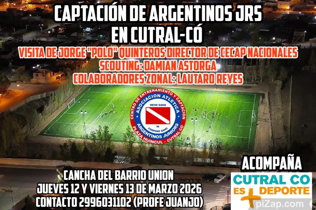 El club Argentinos Juniors llevará a cabo una jornada de captación de jugadores en la ciudad de Cutral Co los días jueves 12 y viernes 13 de marzo de 2026. Las pruebas se desarrollarán en la cancha del Barrio Unión.