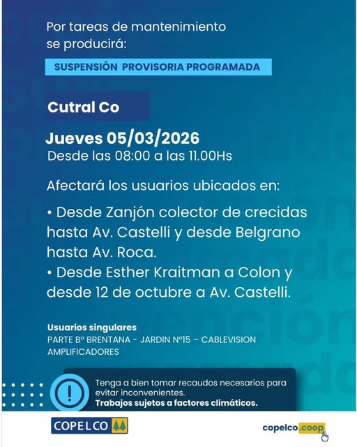 informó que este jueves 5 de marzo de 2026 se realizará una suspensión provisoria programada del servicio eléctrico en la ciudad de Cutral Co, debido a tareas de mantenimiento.