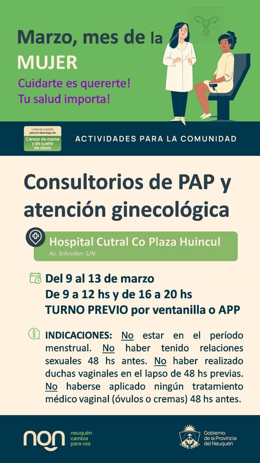 En el marco de las actividades por el Mes de la Mujer, el hospital Cutral Co y Plaza Huincul inició este lunes una jornada especial de consultorios de Papanicolaou (PAP) y atención ginecológica destinada a la comunidad.