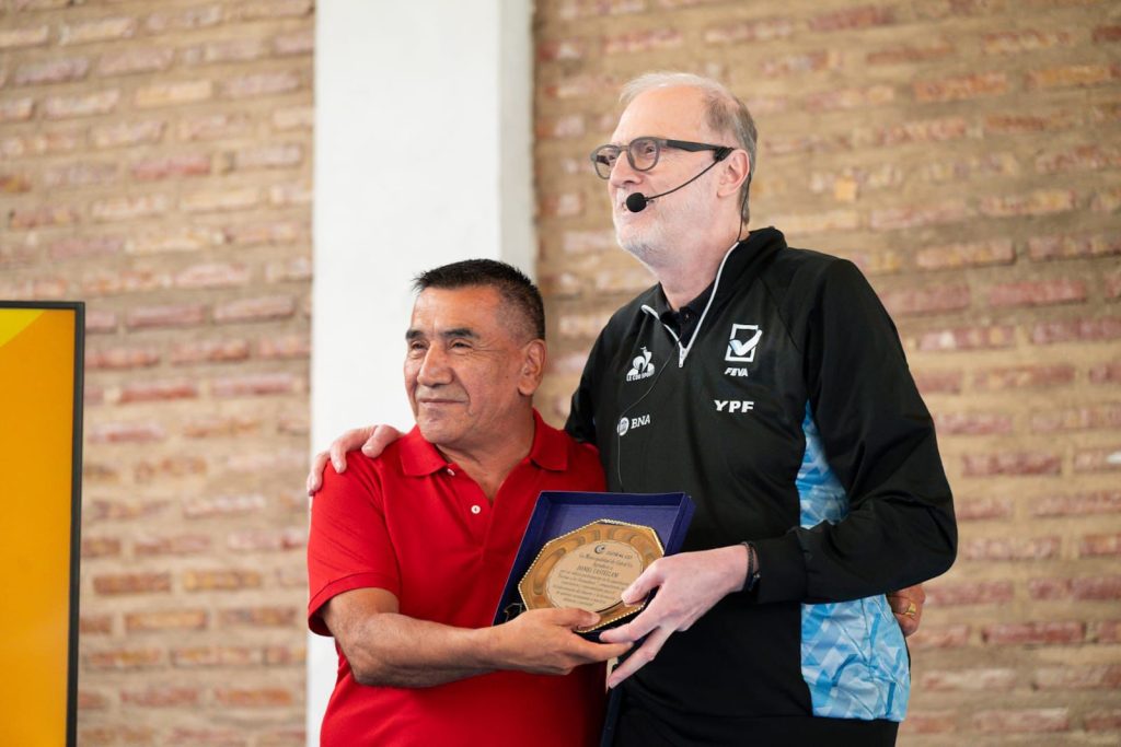El encuentro contó también con la presencia del intendente Ramón Rioseco, quien entregó un presente a Castellani en reconocimiento a su trayectoria y a su aporte a la formación deportiva.