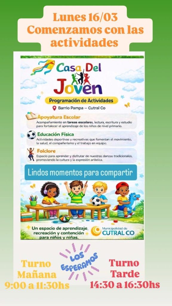 A partir de este lunes 16 de marzo comenzarán las actividades en la Casa del Joven, un espacio destinado al acompañamiento, aprendizaje y recreación de niños y niñas en el barrio Pampa de Cutral Co.