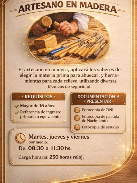 El curso de Artesano en Madera propone aprender a seleccionar la materia prima adecuada para el ahuecado y trabajar distintos relieves utilizando herramientas específicas y técnicas seguras. La capacitación se dictará martes, jueves y viernes por medio, en el horario de 08:30 a 11:30, con una carga horaria total de 250 horas reloj.
