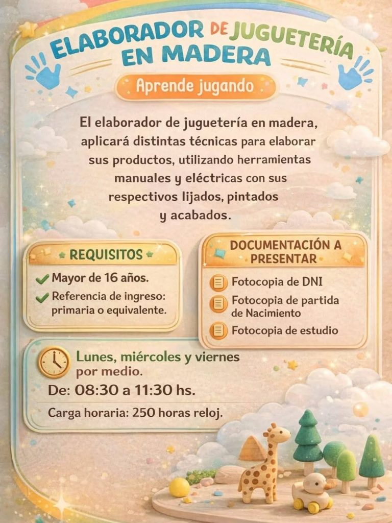 Por su parte, el curso de Elaborador de Juguetería en Madera, bajo la consigna “Aprende jugando”, brindará conocimientos para diseñar y fabricar juguetes utilizando herramientas manuales y eléctricas, además de técnicas de lijado, pintado y acabados. Las clases se desarrollarán lunes, miércoles y viernes por medio, también de 08:30 a 11:30, con 250 horas reloj de duración.