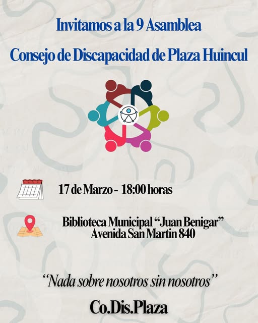 En la ciudad de Plaza Huincul, el Consejo Local de Discapacidad (Co.Dis.Plaza) invita a la comunidad a participar de su 9° asamblea, un espacio que desde hace un año promueve la inclusión y la plena participación de las personas con discapacidad.