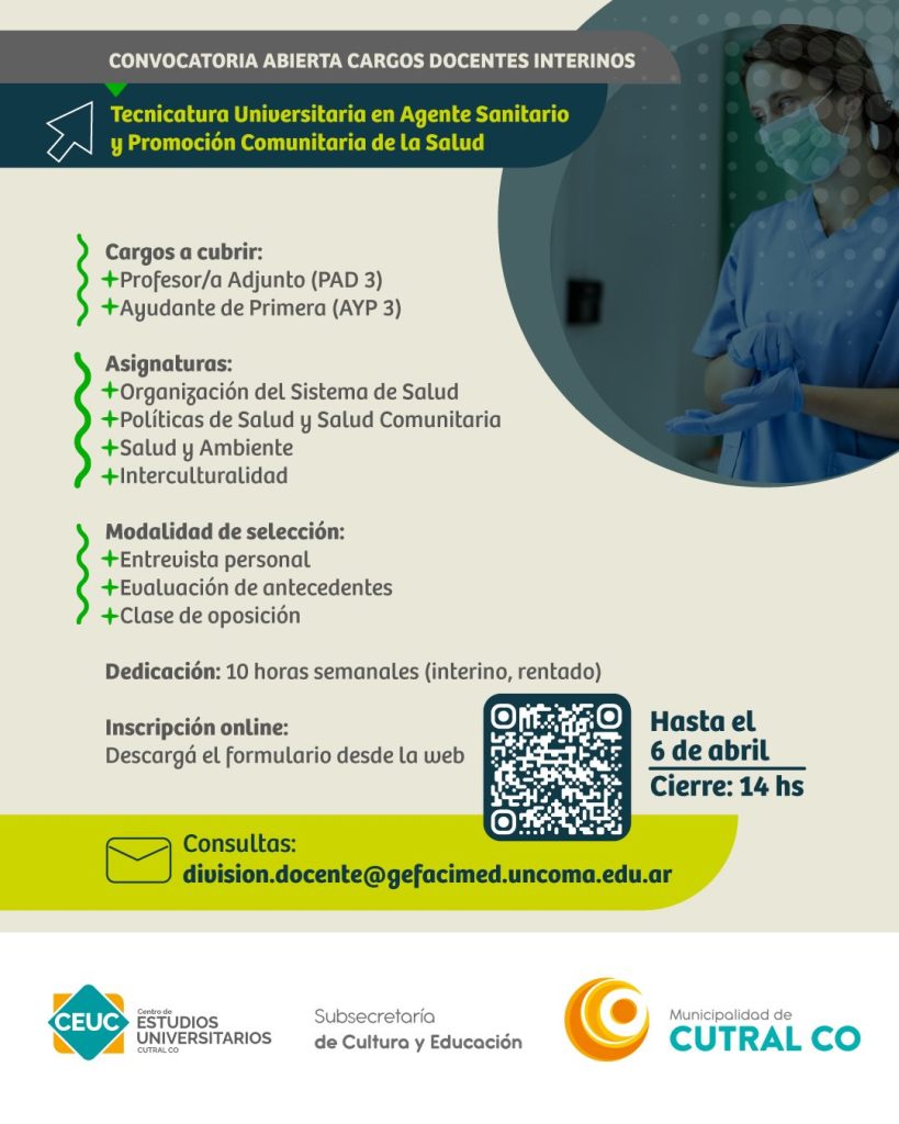 Se encuentra abierta la inscripción para cubrir cargos docentes interinos en la Tecnicatura Universitaria en Agente Sanitario y Promoción Comunitaria de la Salud, carrera que se dicta en la ciudad de Cutral Co y que depende de la Facultad de Ciencias Médicas de la Universidad Nacional del Comahue.