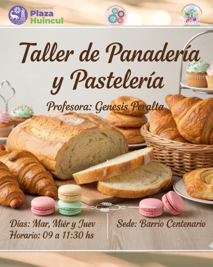 La Plaza Huincul lanzó un Taller de Panadería y Pastelería gratuito, destinado a mayores de 18 años. La capacitación, a cargo de la profesora Génesis Peralta, se dicta en barrio Centenario los martes, miércoles y jueves de 9:00 a 11:30.