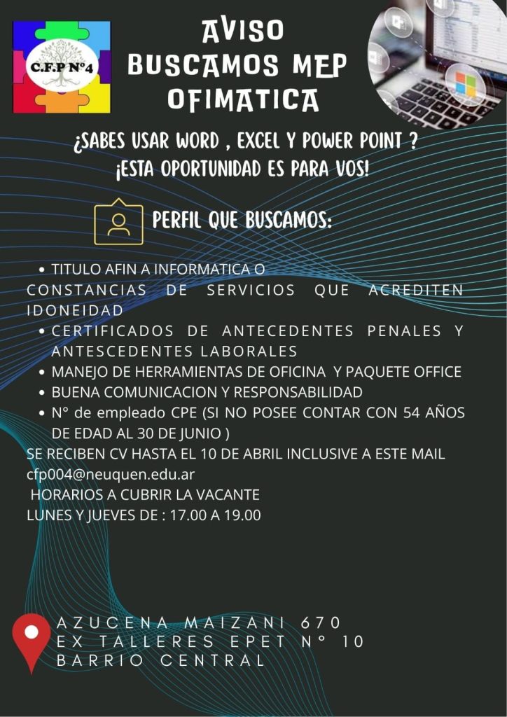 El Centro de Formación Profesional N°4 lanzó una convocatoria para cubrir una vacante como MEP (Maestro de Enseñanza Práctica) en el área de informática, orientada a personas con conocimientos en herramientas informáticas como Word, Excel y PowerPoint.