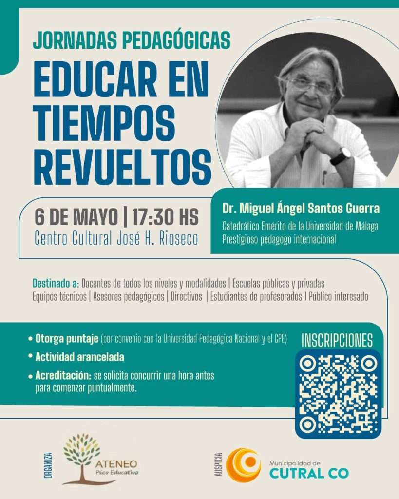 El próximo 6 de mayo a las 17:30 horas, el Centro Cultural José Héctor Rioseco de Cutral Co albergará una nueva jornada pedagógica titulada “Educar en tiempos revueltos”, que estará a cargo del reconocido pedagogo internacional Miguel Ángel Santos Guerra. La propuesta apunta a reflexionar sobre los desafíos actuales de la educación en contextos cambiantes.