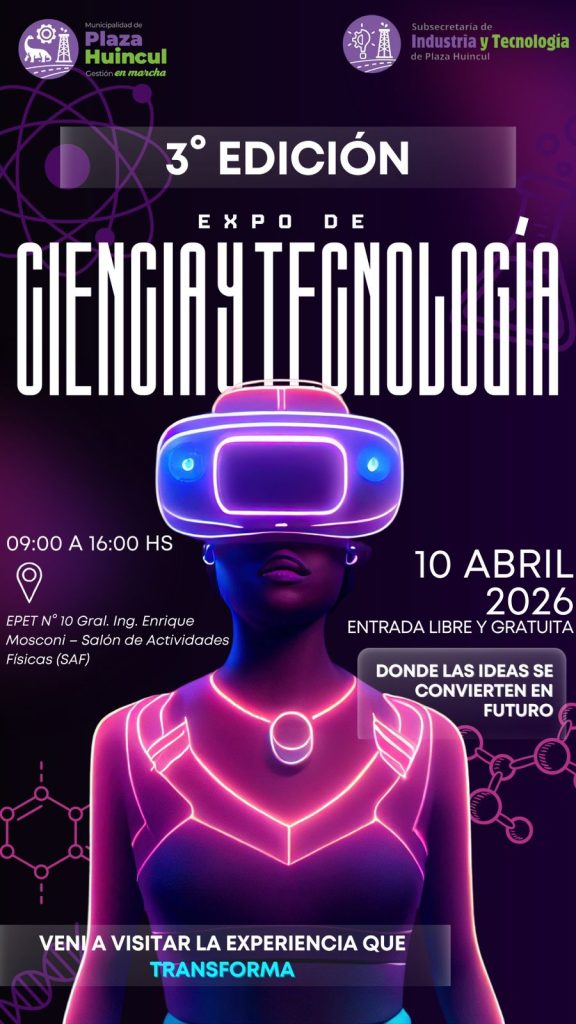 Está todo listo para la 3° edición de la Expo de Ciencia y Tecnología 2026 en Plaza Huincul. Será este viernes de 9 a 16, en el Salón de Actividades Físicas -SAF-de la Epet N° 10.