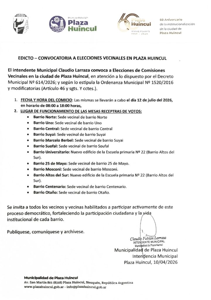 Se conoció hoy la convocatoria a los comicios barriales en Plaza Huincul. El llamado está encuadrado en el decreto N° 614 y la ordenanza N° 614 de este año y la norma N° 1.520 con las modificatorias.