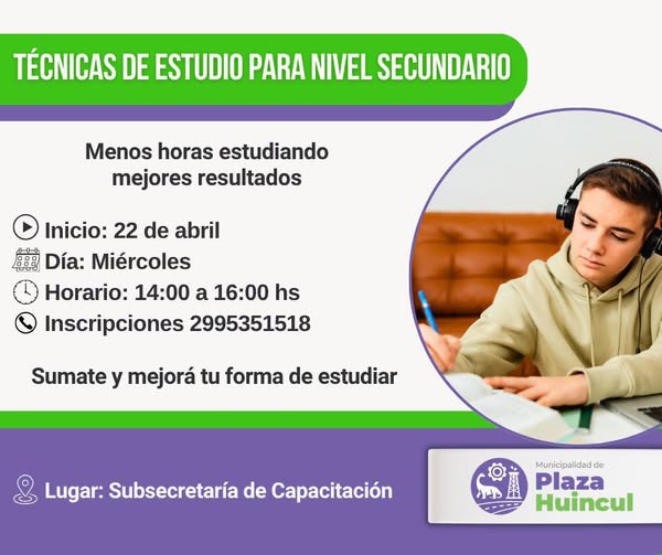 Plaza Huincul, a través de la subsecretaría de Capacitación, anunció el inicio de un taller de técnicas de estudio destinado a estudiantes de nivel secundario, con el objetivo de mejorar el rendimiento académico optimizando el tiempo de estudio.