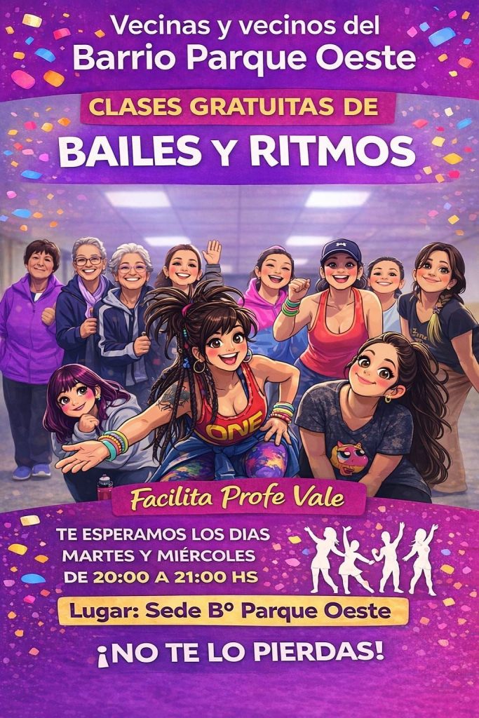 En el barrio Parque Oeste se están llevando adelante clases gratuitas de baile, una iniciativa pensada para promover el encuentro, la actividad física y la integración social entre vecinos y vecinas de todas las edades. Las clases se desarrollan martes y miércoles de 20 a 21 horas.