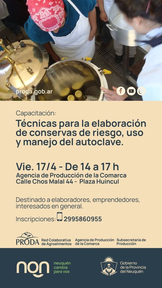 La Agencia de Producción de la Comarca llevará adelante una capacitación destinada a elaboradores, emprendedores y público en general sobre “Técnicas para la elaboración de conservas de riesgo, uso y manejo del autoclave”.