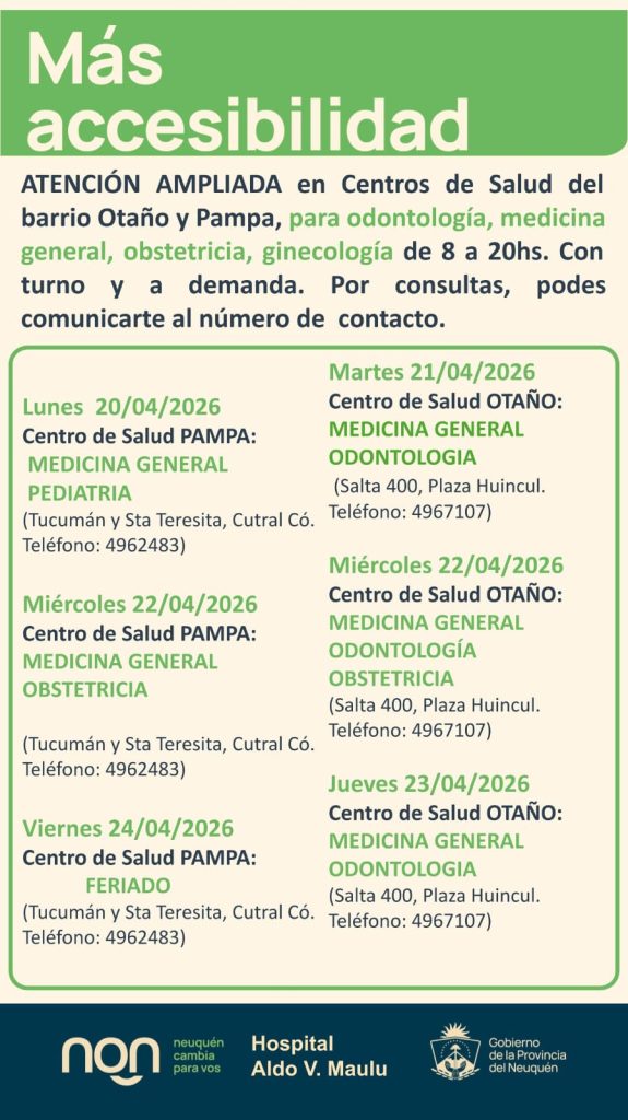 La atención se desarrollará en el horario de 8 a 20 horas, tanto con turnos programados como por demanda espontánea. Las especialidades disponibles incluyen medicina general, obstetricia, ginecología y odontología.