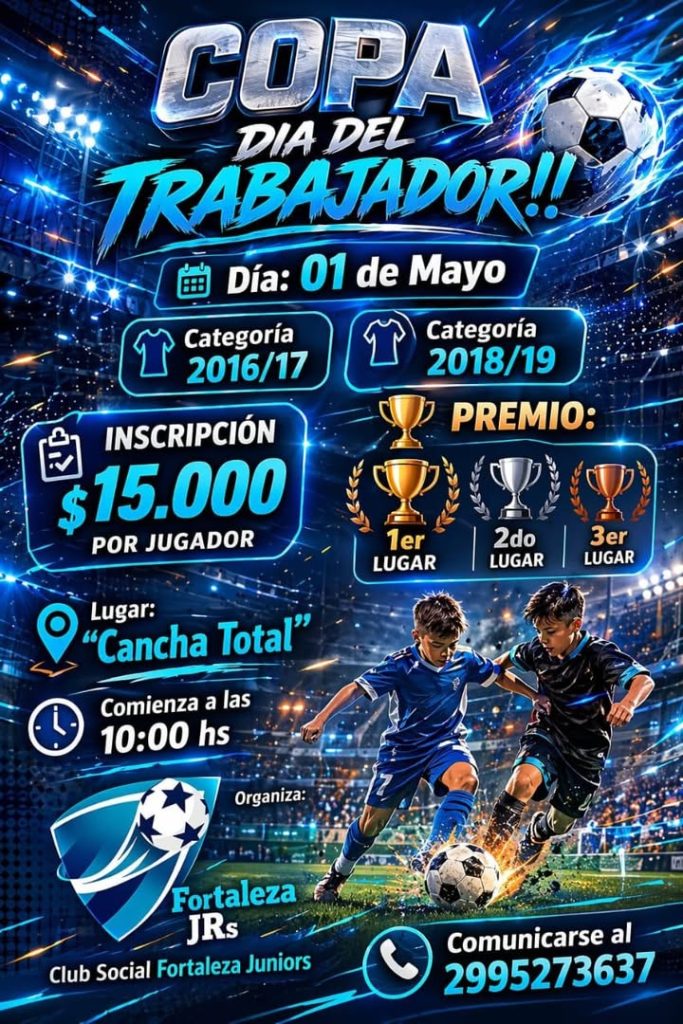 El Club Social Fortaleza Juniors llevará a cabo un torneo de fútbol denominado “Copa Día del Trabajador” el próximo 1 de mayo. El evento se desarrollará en el predio “Cancha Total” y el inicio de la actividad está programado para las 10:00 horas.