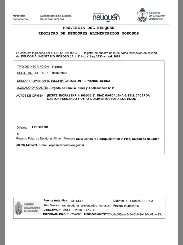 La Comisión Directiva informó que se verificó un incumplimiento parcial en la documentación de la agrupación mencionada, señalando específicamente el caso de Gastón Fernando Cerda. De acuerdo con un certificado oficial del Registro de Deudores Alimentarios Morosos con fecha del 22 de abril de 2026, Cerda figura con una inscripción vigente en calidad de deudor desde el 9 de julio de 2021. El registro corresponde a una causa por alimentos para sus hijos en el Juzgado de Familia, Niñez y Adolescencia N° 2.