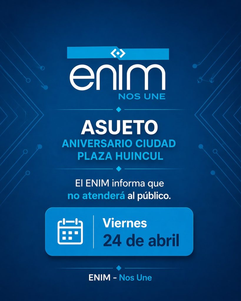 Desde el Ente Autárquico Intermunicipal El Mangrullo, Enim, se anunció que este viernes 24, no habrá atención al púbico porque se suma al asueto por el aniversario de Plaza Huincul.