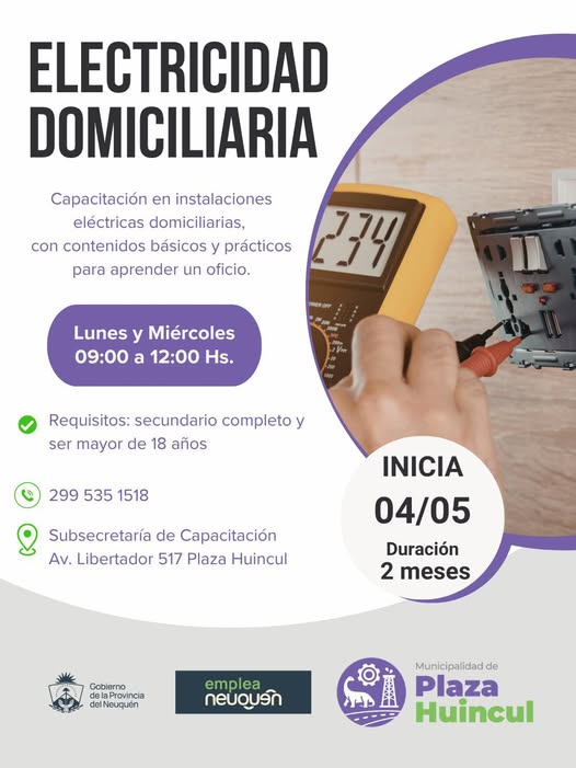 La capacitación comenzará el próximo 4 de mayo y se dictará dos veces por semana, los días lunes y miércoles de 9 a 12 horas. Según se informó, el contenido del curso permitirá a los participantes adquirir conocimientos para la instalación, mantenimiento y reparación de sistemas eléctricos en viviendas, apuntando tanto a quienes buscan una salida laboral como a quienes desean emprender de manera independiente.