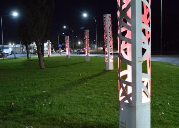 En Plaza Huincul se iluminó la plazoleta de Las Banderas de color rosa