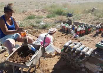 Se quedó sin hogar y pide ayuda voluntaria para rellenar las botellas que necesita para levantar las paredes